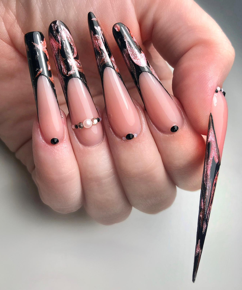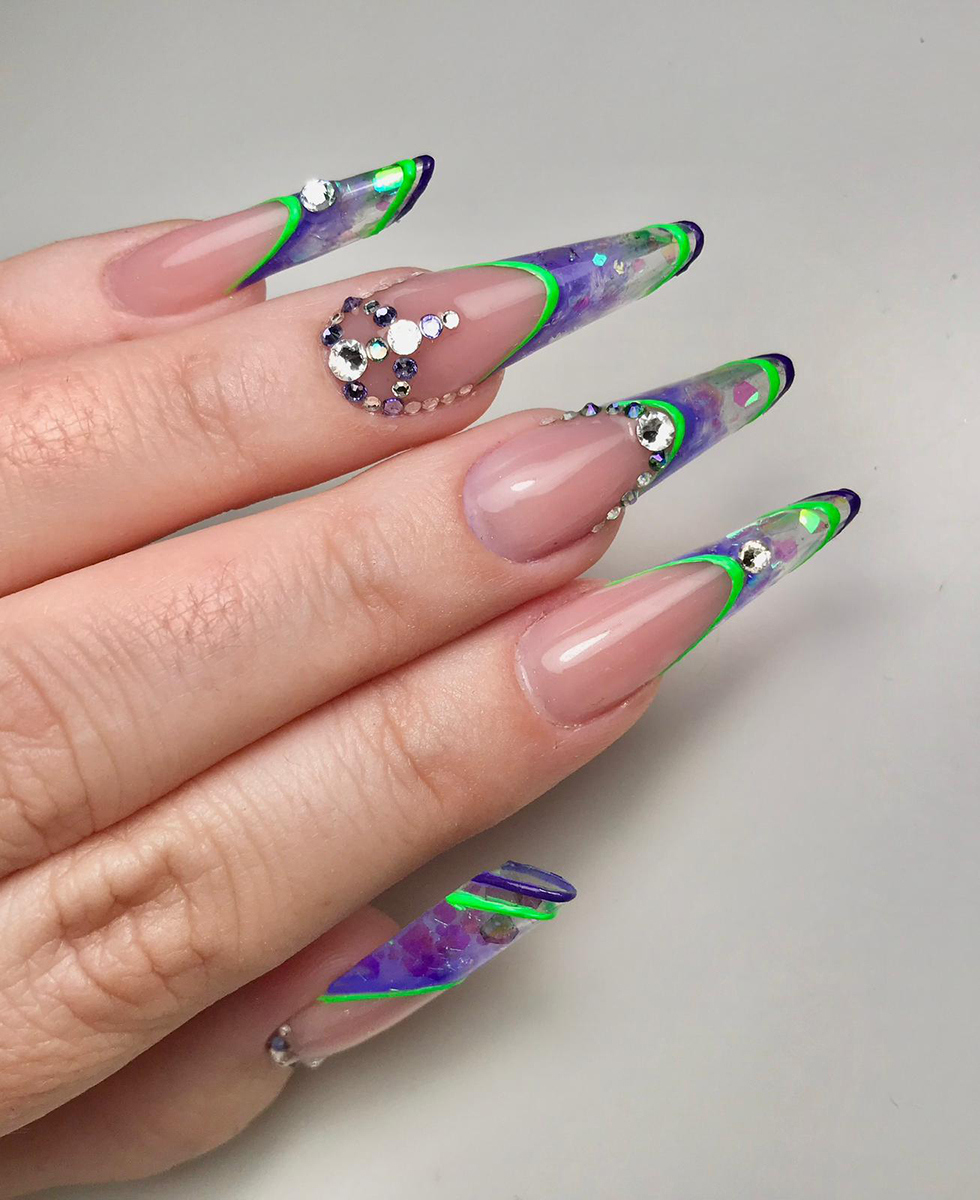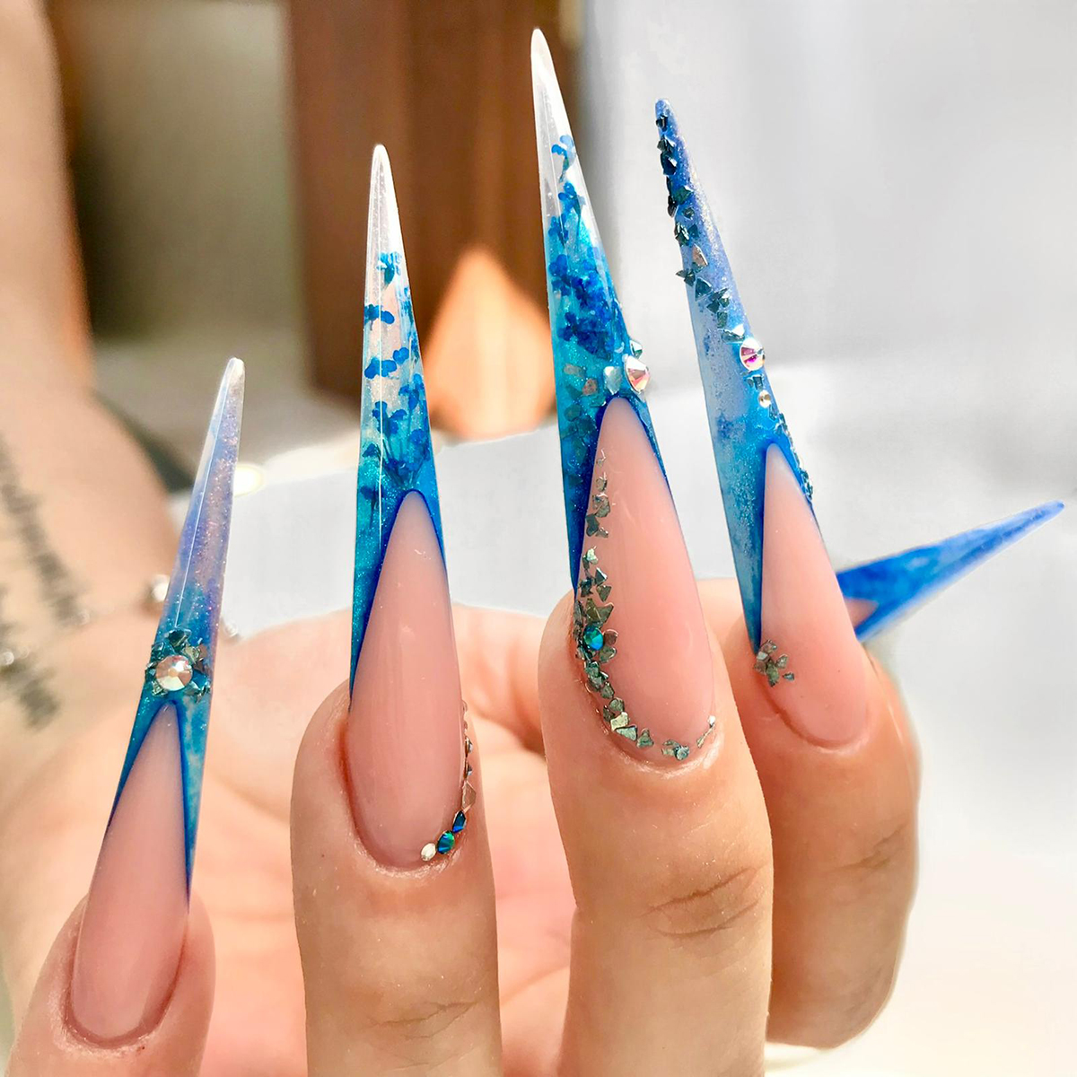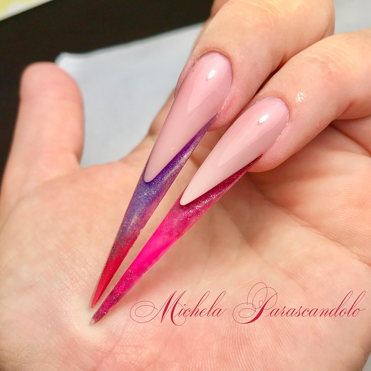 Impara a realizzare due forme estreme come mandorla russa e stiletto in gel/acrygel e diversi effetti decorativi.