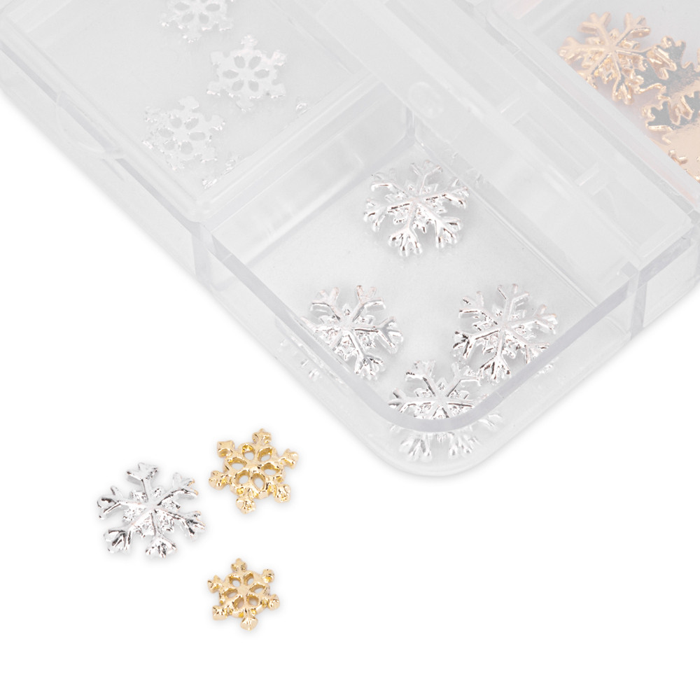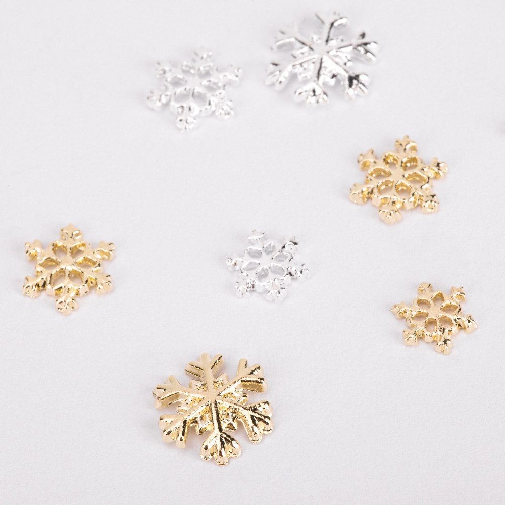 Scatola da 30 pezzi di borchie argento e oro con fiocchi di neve di 3 misure diverse.
