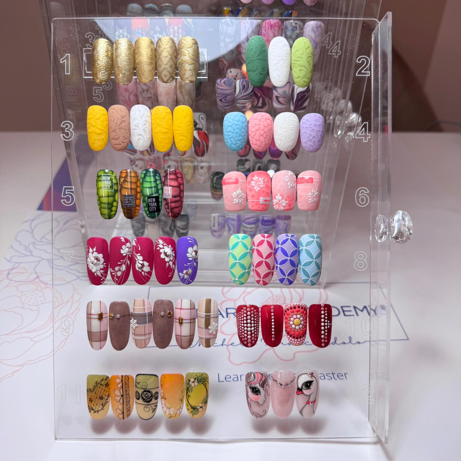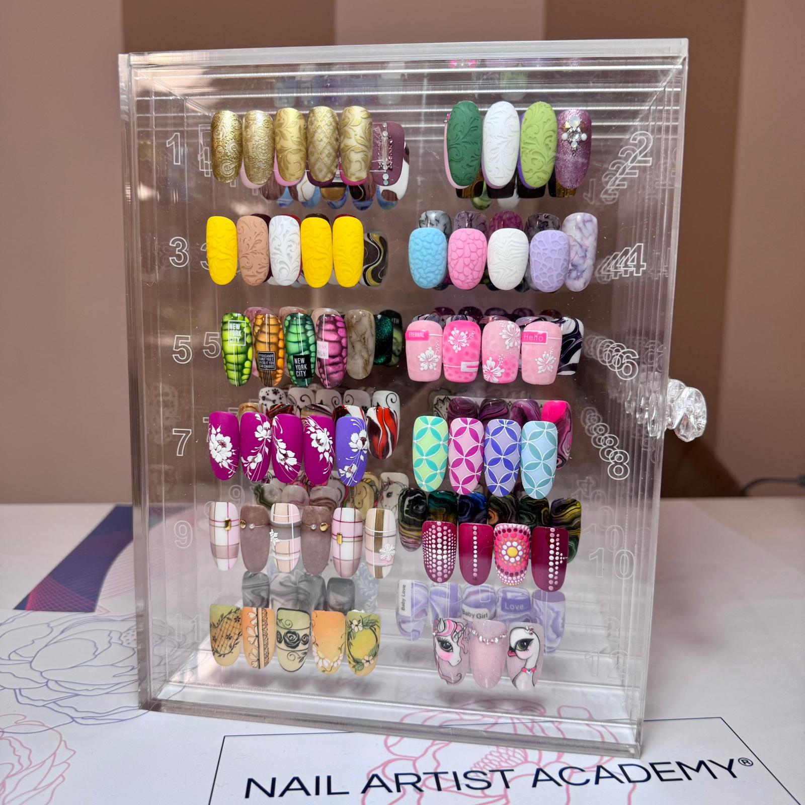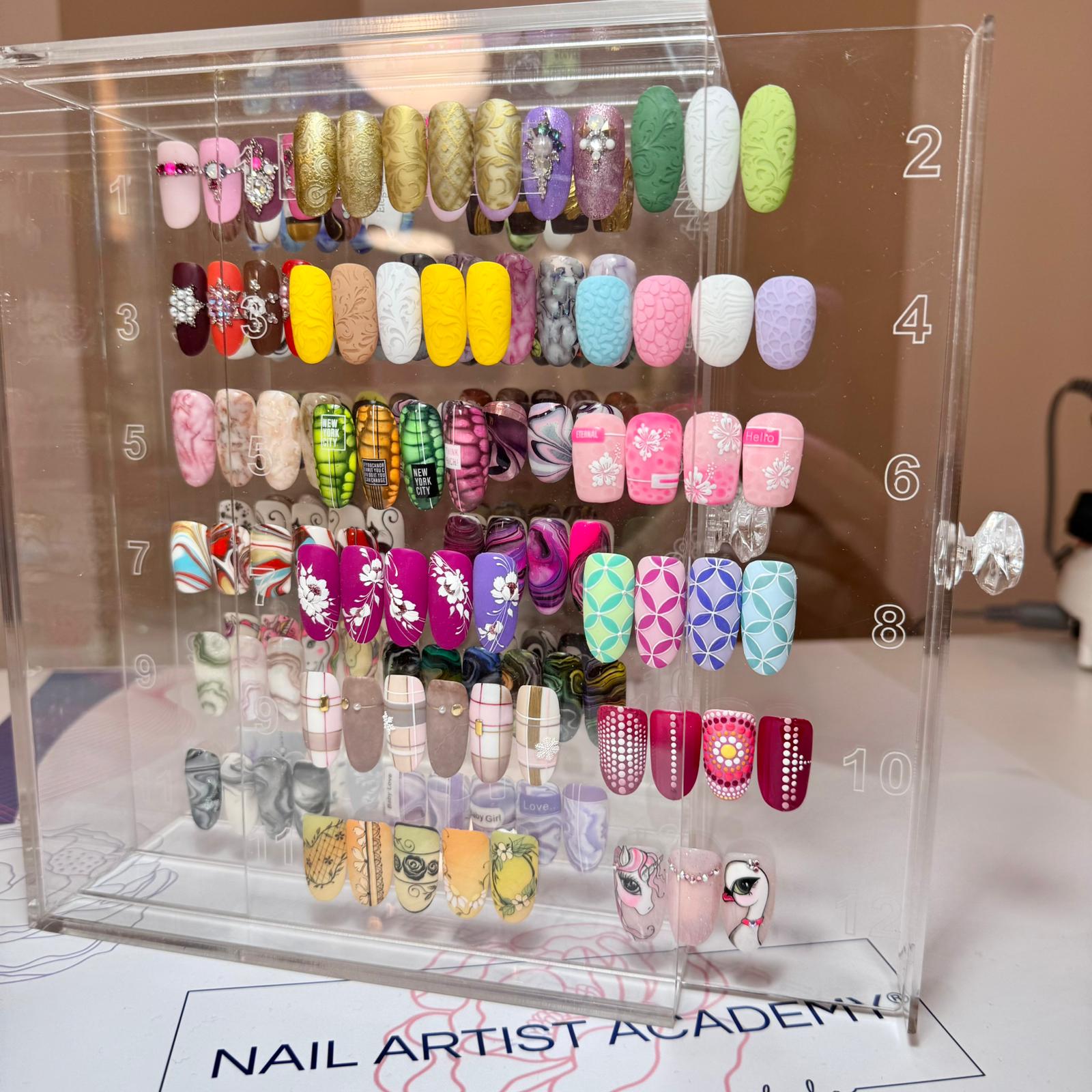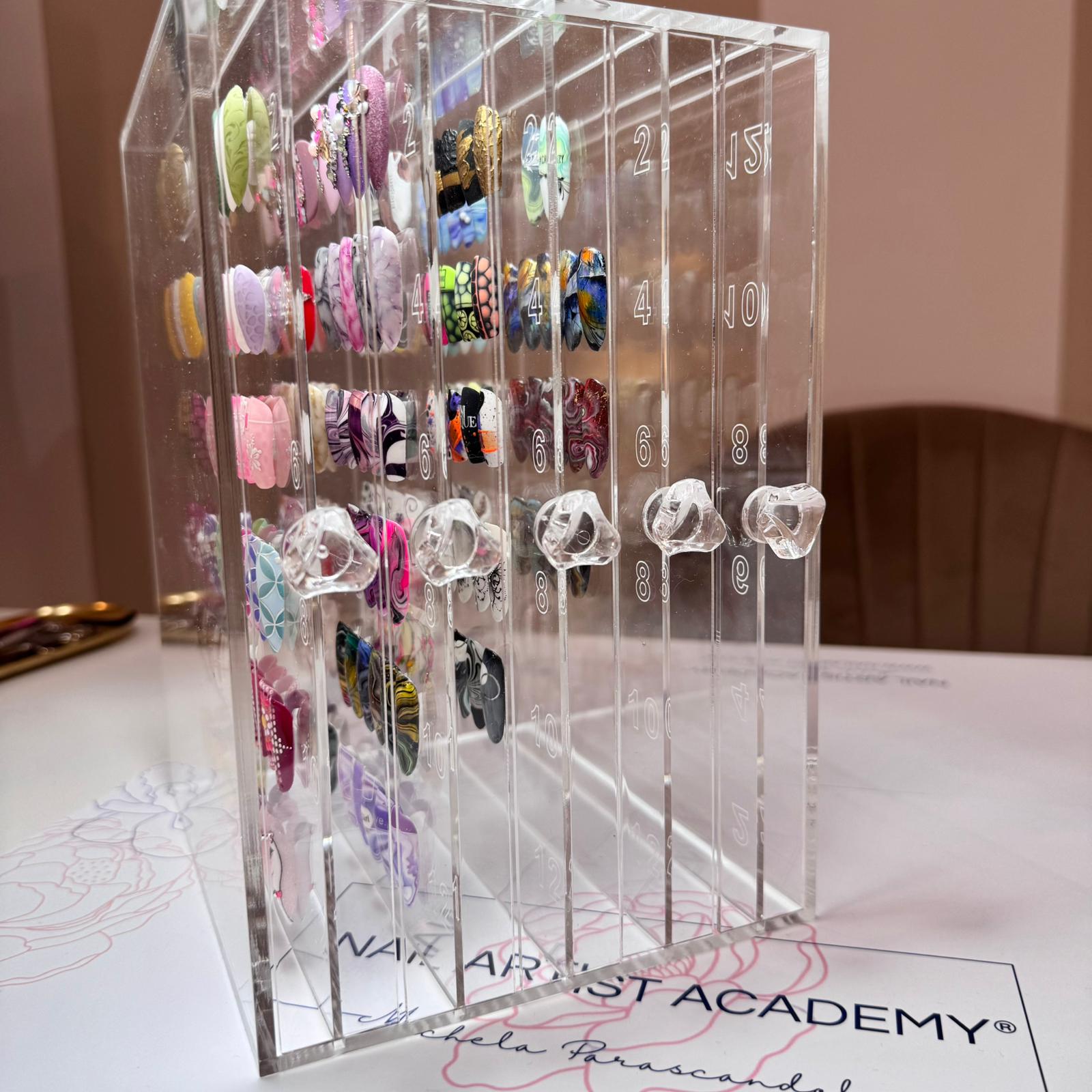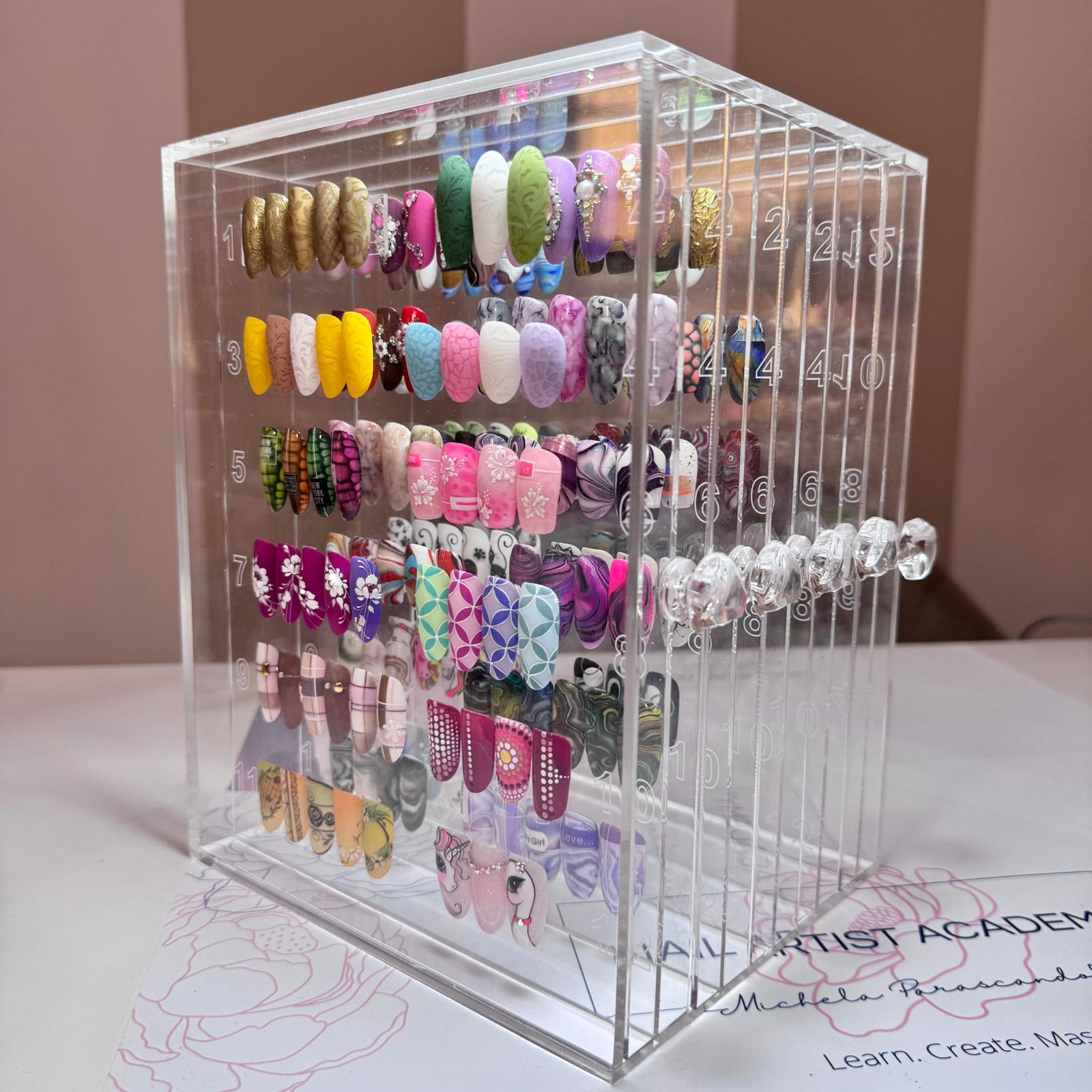 Elegante e originale espositore a cassetti in acrilico trasparente eccezionalmente spesso e resistente, adatto per mettere in mostra le tue nail art o i tuoi colori.